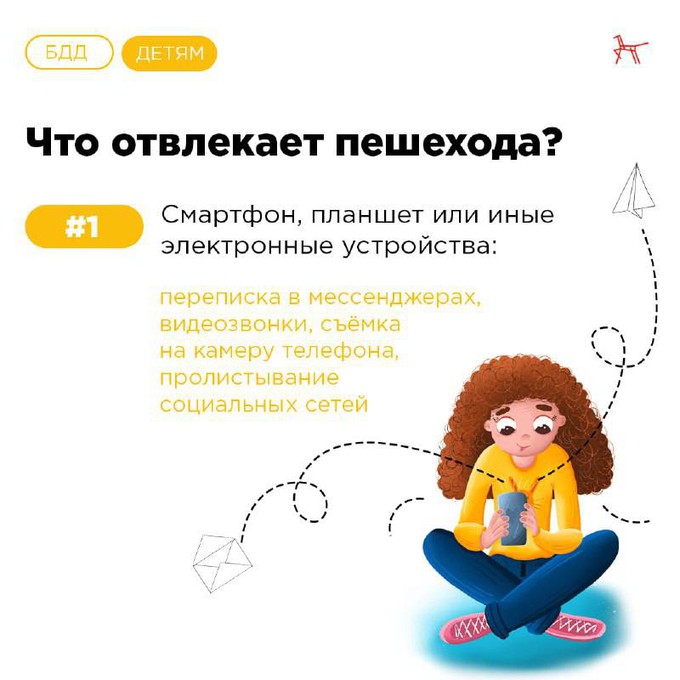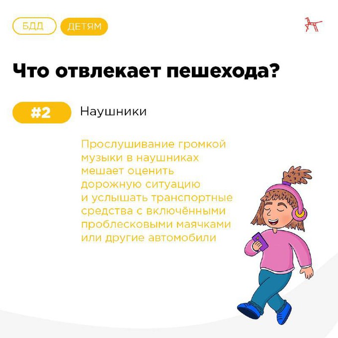 Дорожное движение — это сложный процесс, который зависит от большого количества факторов и каждого участника движения: и водителя, и пешехода. Чтобы пешеходу оставаться в безопасности нужно оставаться внимательным вблизи проезжей части дороги и при её переходе. Центр по профилактике ДДТТ Института воспитания подготовил карточки, где собраны основные факторы, отвлекающие внимание пешеходов.