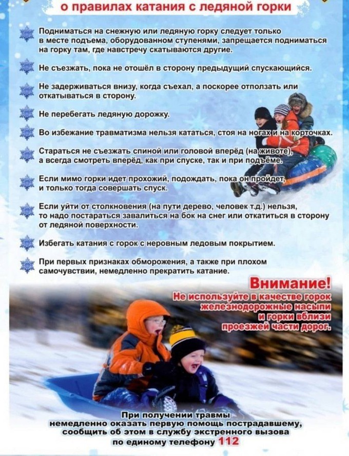 — Прежде чем ребенок сядет на санки, проверьте, нет ли в них неисправностей. Если санки оснащены ремнями безопасности, то обязательно пристегните ребенка. — Если при катании ребенка на санках необходимо перейти дорогу, его необходимо высадить из санок. Не катайтесь с ребенком вместе на одних санках. — Расскажите ребенку, что на горках нужно вести себя аккуратно и дисциплинированно, соблюдать очередь при спуске. — Убедитесь в безопасности горки сами, перед катанием внимательно изучите местность. Проследите за тем, чтобы горку не перекрывали деревья, кусты, столбы уличного освещения или заборы. — Запретите ребенку кататься с горок, которые расположены рядом с дорогой, водоёмом. Правила безопасного катания на тюбинге Тюбинг стремительно завоевывает популярность в нашей стране. Легкие, удобные, яркие надувные санки стали настоящим хитом продаж этой зимы среди любителей активного отдыха. — Используйте тюбинги, подходящие по размеру. — Катайтесь на специально оборудованных трассах. — Не спускайтесь «паровозиком», не связывайте тюбинги друг с другом. — Опасно кататься на санках вдвоем, вместе с детьми. — Следите, чтобы на вашем пути не было других катающихся. — Запрещено привязывать сноутюбы к транспортным средствам: снегоходам, автомобилям. — Катайтесь только сидя. — Перед каждым катанием проверяйте состояние ватрушки. — Выбирайте качественные тюбинги.