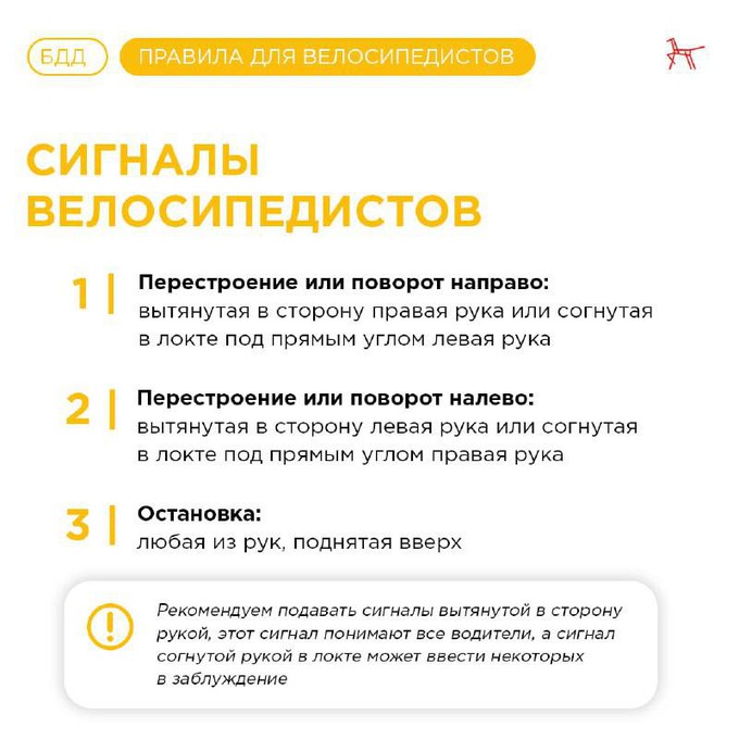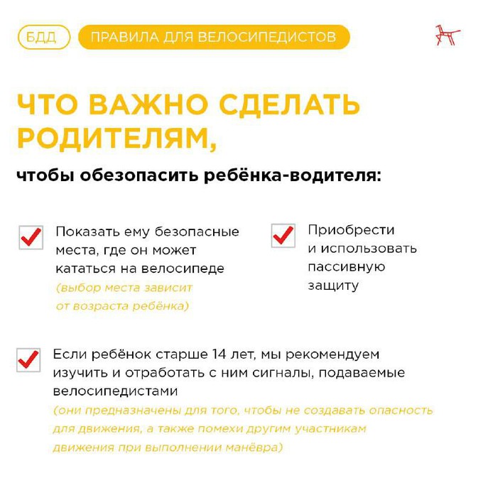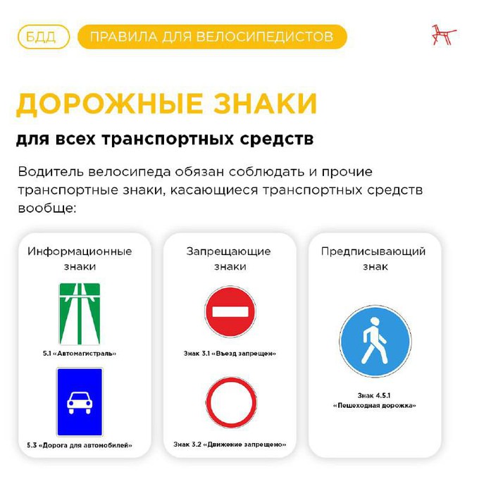 Велопрогулки — это хороший способ полезно занять ребёнка. Но важно позаботиться и о безопасности. Напомните ребёнку: - велосипеду не место на проезжей части; - нужно думать о прохожих и управлять своим средством передвижения аккуратно; - нужно быть внимательным при управлении и позаботиться о средствах защиты. Института воспитания Центр по профилактике ДДТТ собрал для вас правила дорожного движения для велосипедистов и регулирующие движение дорожные знаки.