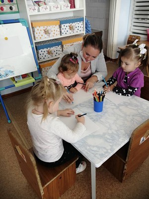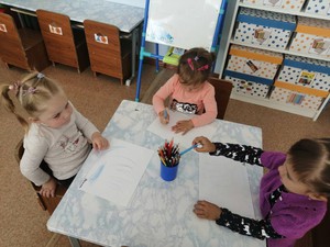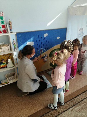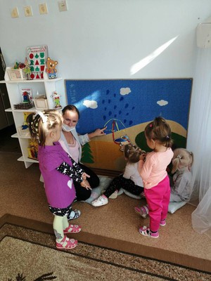 На образовательной деятельности по художественно – эстетическому развитию, дети младшей группы отправились в Фиолетовый лес, в гости к Крутику По. В ходе путешествия, ребята выяснили, что он очень любит гулять под дождем. Крутик По, познакомил детей с природным явлением – дождем и предложил ребятам, нарисовать свой «дождик». Малыши упражнялись в умении ритмично наносить штрихи, располагая, их по всему листу. Вместе с Крутиком По находили сходство штрихов с капельками дождя.