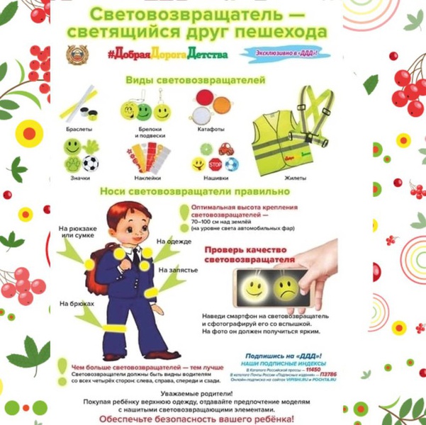 Световозвращатель на одежде — на сегодняшний день реальный способ уберечь ребёнка от травмы на неосвещённой дороге. Принцип действия его основан на том, что свет, попадая на ребристую поверхность из специального пластика, концентрируется и отражается в виде узкого пучка. Когда фары автомобиля «выхватывают» пусть даже маленький световозвращатель, водитель издалека видит яркую световую точку. Поэтому шансы, что пешеход или велосипедист будут замечены, увеличиваются во много раз. Например, если у машины включен ближний свет, то обычного пешехода водитель увидит с расстояния 25-40 метров. А использование световозвращателя увеличивает эту цифру до 130-240 метров! Маленькая подвеска на шнурке или значок на булавке закрепляются на одежде, наклейки — на велосипеде, самокате, рюкзаке, сумке. На первый взгляд световозвращатель выглядит как игрушка. Но его использование, по мнению экспертов по безопасности дорожного движения, снижает детский травматизм на дороге в шесть с половиной раз! Световозвращатель не боится ни влаги, ни мороза – носить его можно в любую погоду.