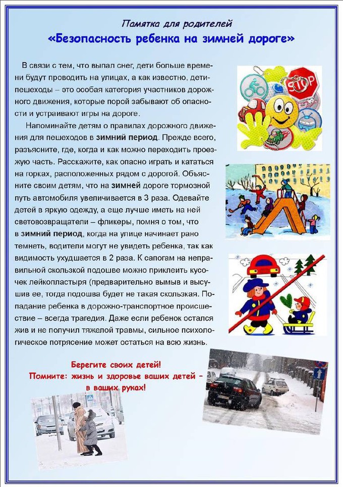 В рамках проведения комплексного мероприятия по профилактике детского дорожно-транспортного травматизма "Внимание,зимние каникулы" для родителей были представлены памятки, инструктажи, направленные на повышение интереса и усиления родительского контроля на необходимость соблюдения правил дорожного движения и выборе безопасных мест для организации досуга детей. Дать ребенку основы дорожной безопасности задача непростая, но еще сложнее научить его использовать полученные знания в повседневной жизни. И здесь главным методом воспитания должен стать личный пример. Главным для формирования у ребенка навыков безопасного поведения на дороге для родителей должен стать принцип " Делай, как я". Чтобы ребенок не нарушал правил дорожного движения, он должен их не просто знать-у него должно войти в привычку их соблюдать. Быть аккуратными и дисциплинированными водителями и пешеходами в глазах подрастающего поколения, подавать им правильный пример- залог сохранения жизни и здоровья наших детей на дорогах.